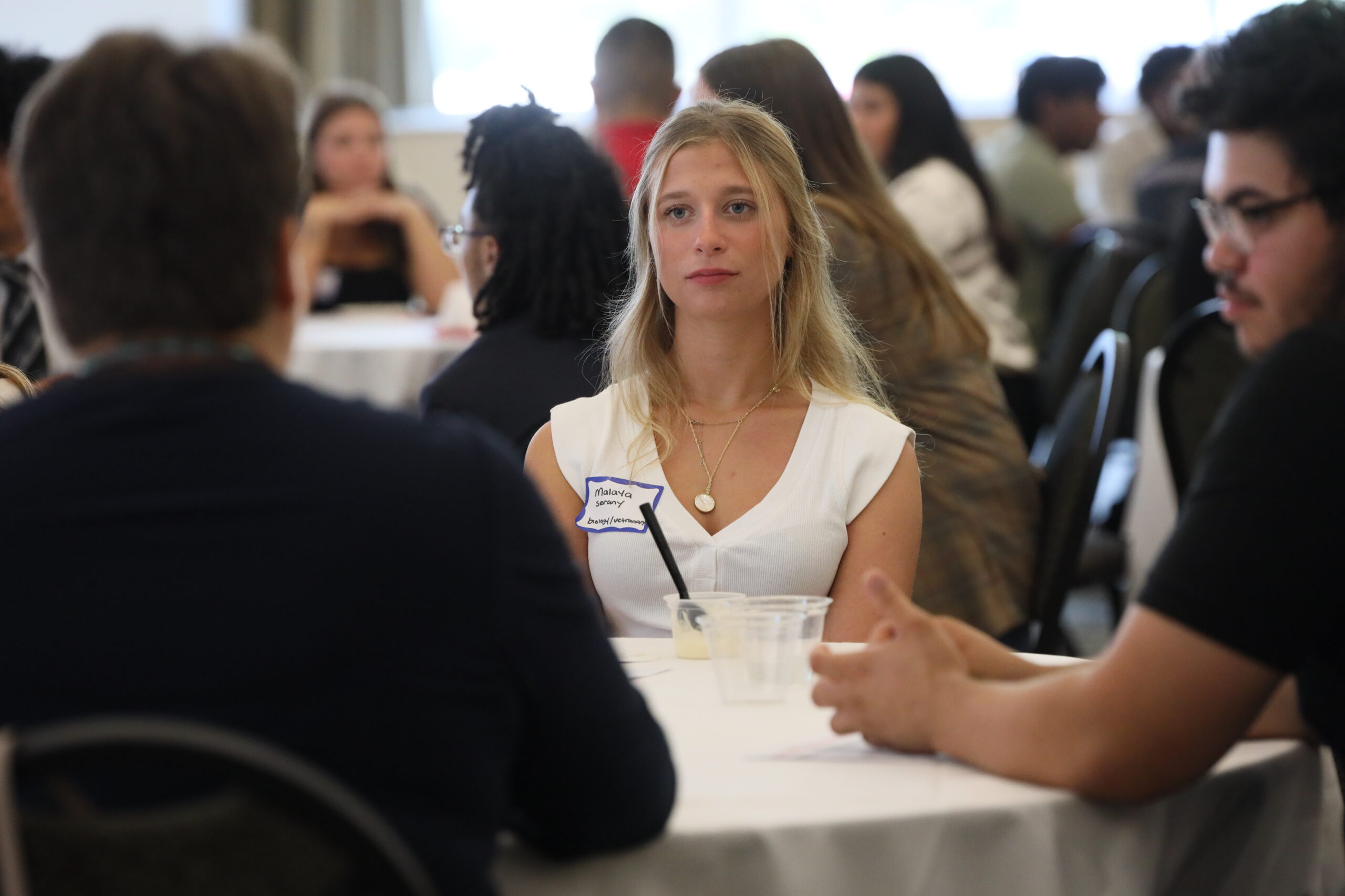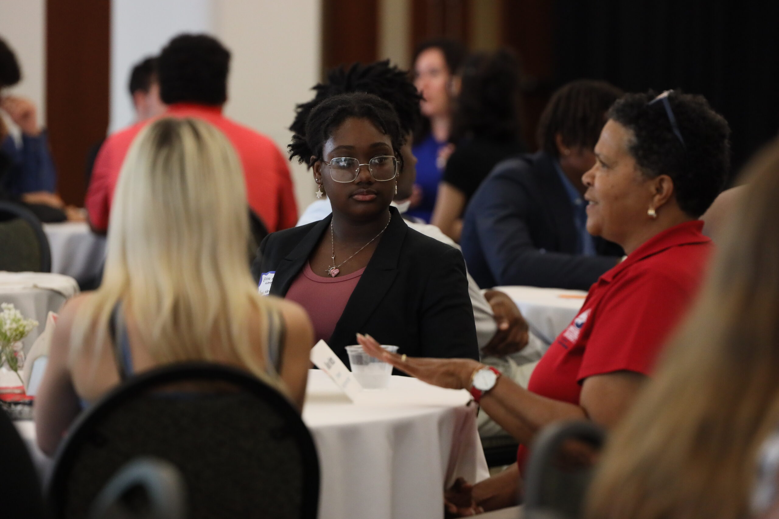 More than 20 professionals across various fields, including business, education, government and nonprofit leadership, participated in small-group discussions with ASP students. Employers and alumni were seated at designated tables, and students moved from table to table every 15 minutes to meet and engage with each professional.